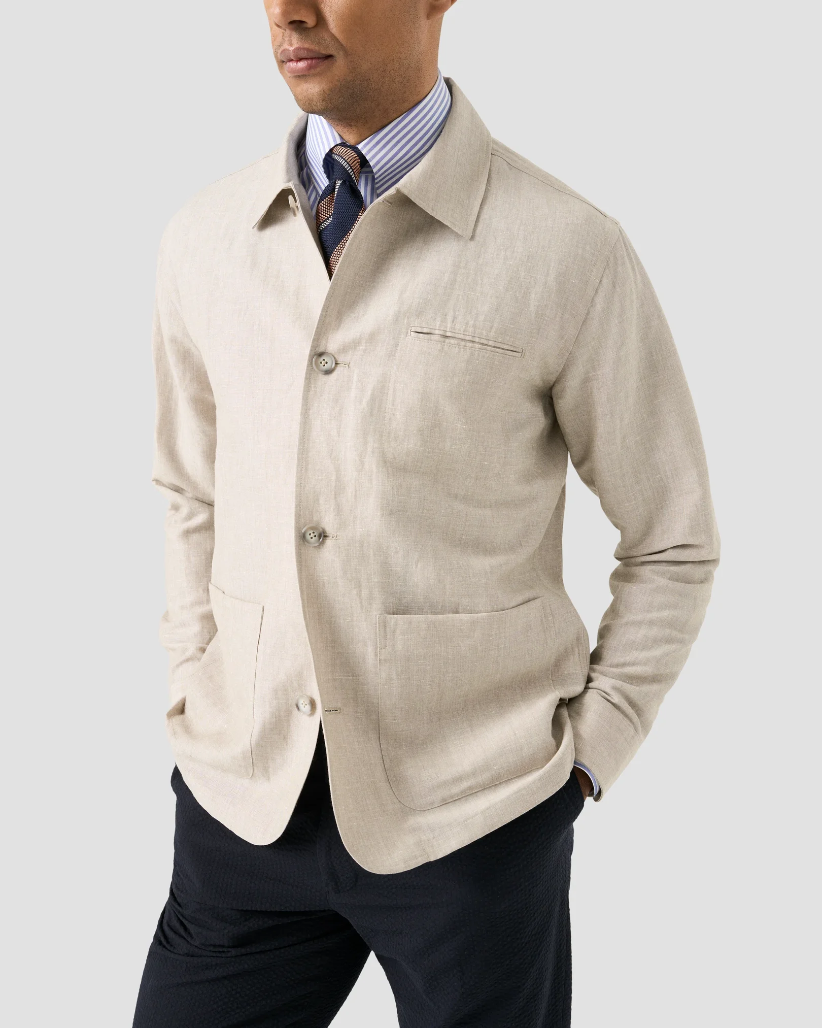 طراحی ساده با جزئیات دقیق، دو جیب بزرگ جلویی و یک جیب سینهای، علاوه بر زیبایی، عملکردی کاربردی برای استفاده روزمره دارد. رنگ سرمهای عمیق این مدل بهراحتی با بیشتر آیتمهای کمد شما از شلوار طوسی گرفته تا جین آبی یا خاکی هماهنگ میشود.